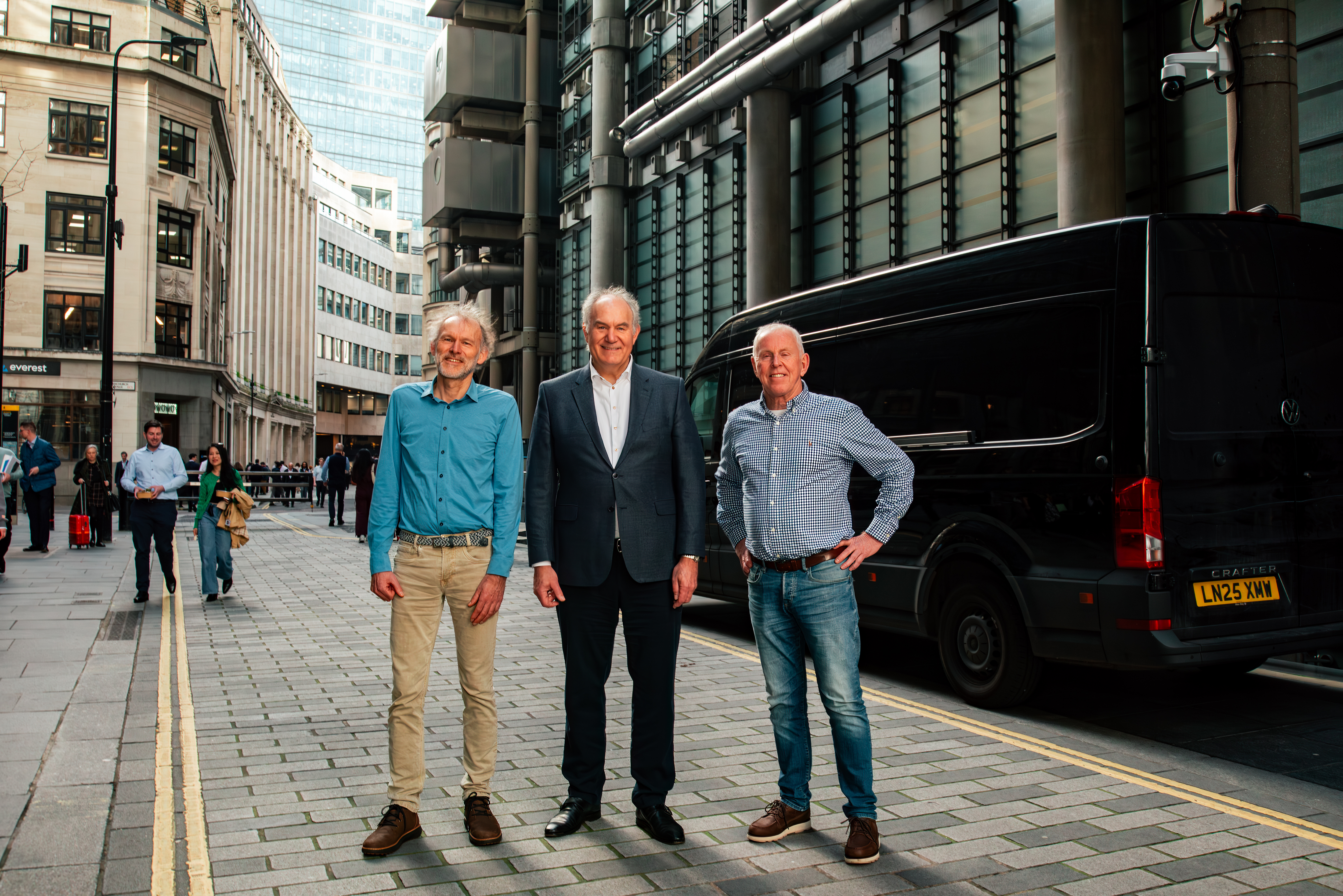 Jelte Buikema, Ralph van Helden en Kasper Huizinga voor het Lloyd's gebouw in London.